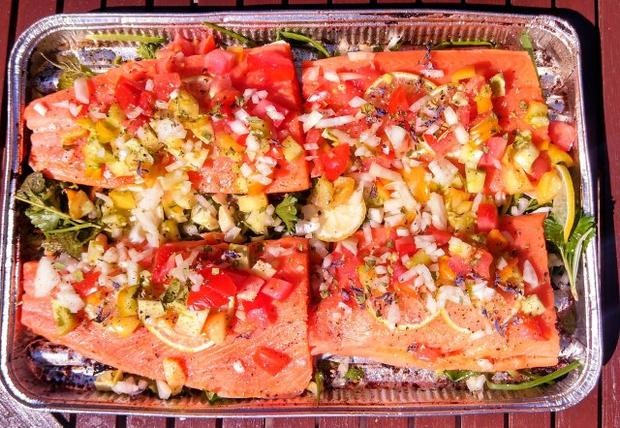 Rohe Lachsstücke auf Kräuterbett legen, mit Limetten oder Zitronen-Scheiben, gehackten Tomaten und Kräutern belegen und würzen. Etwas Oliven Öl darüber träufeln und auf vorgeheiztem Grill zugedeckt grillieren.